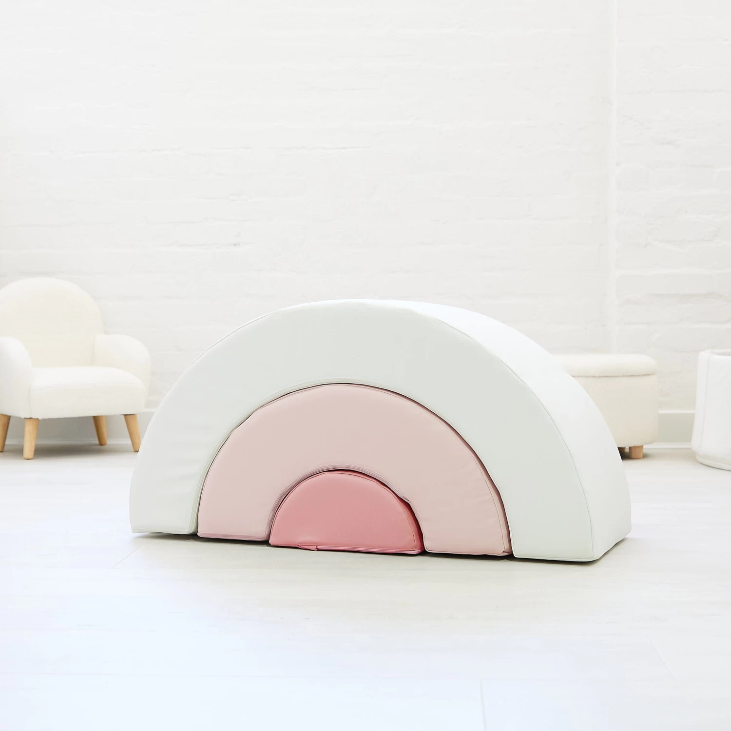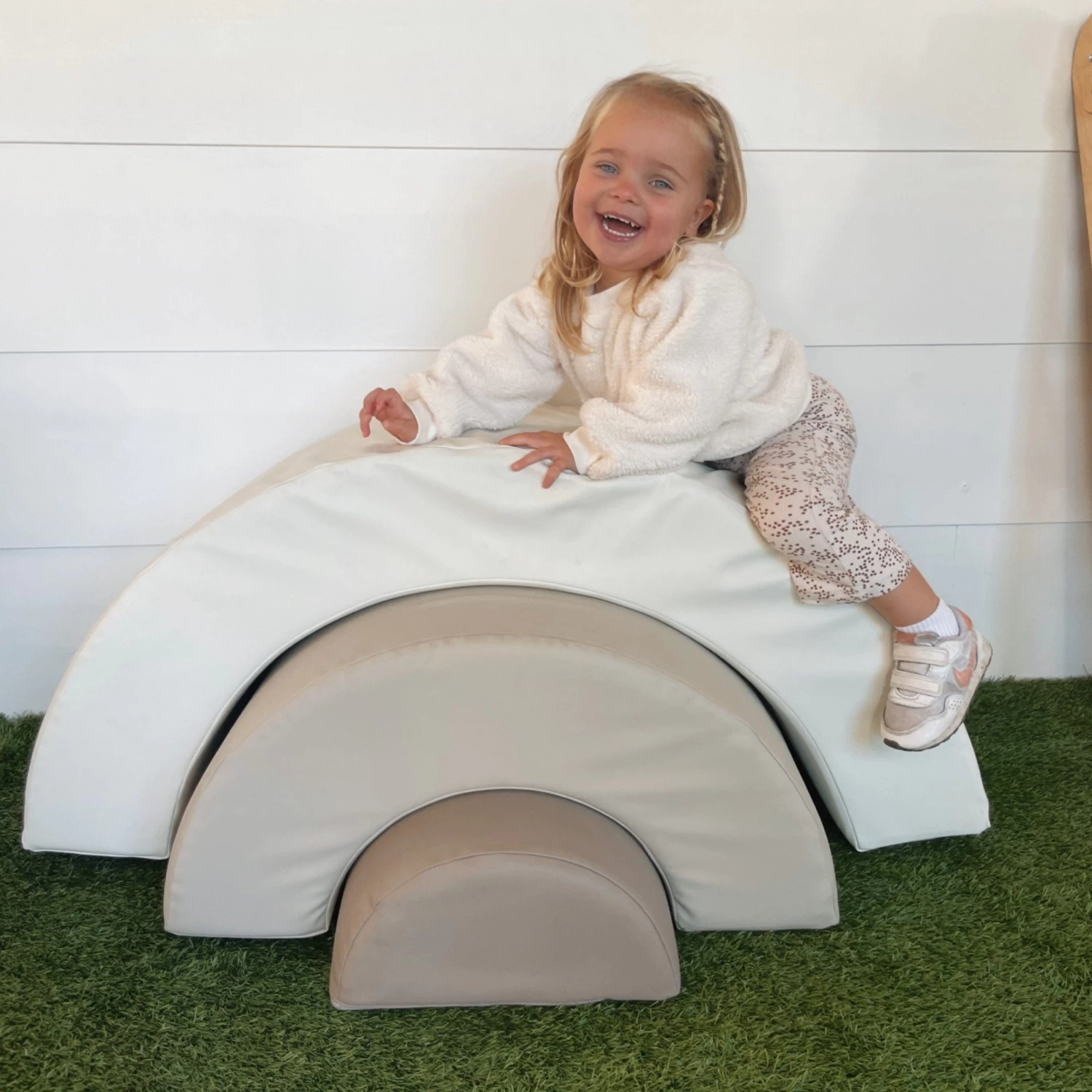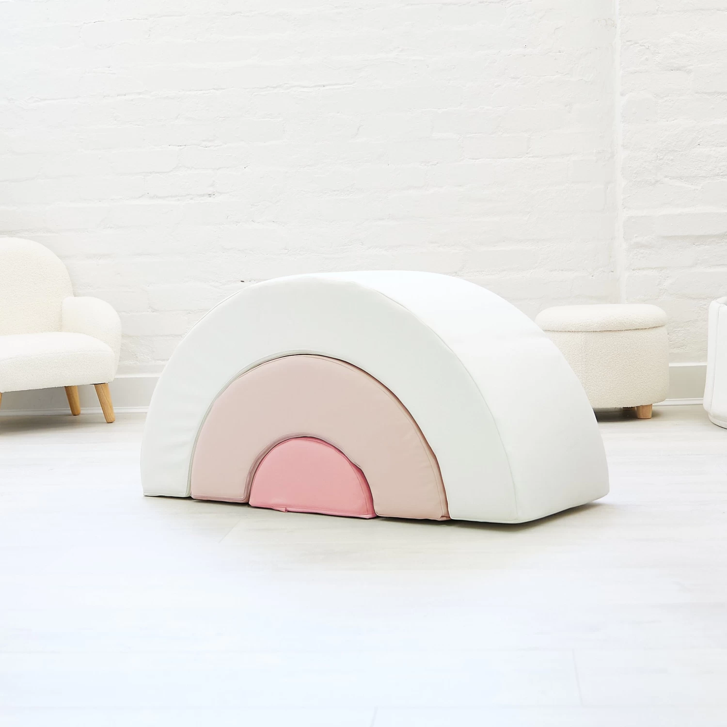 Velcro strips hold the 3 x base pieces securely in place. The lightweight foam pieces are covered in high quality PVC. They are durable, lightweight and easy to move around and easy to clean. The rainbow arch shape can be pulled apart for climbing & crawling fun and then put back together like a puzzle.