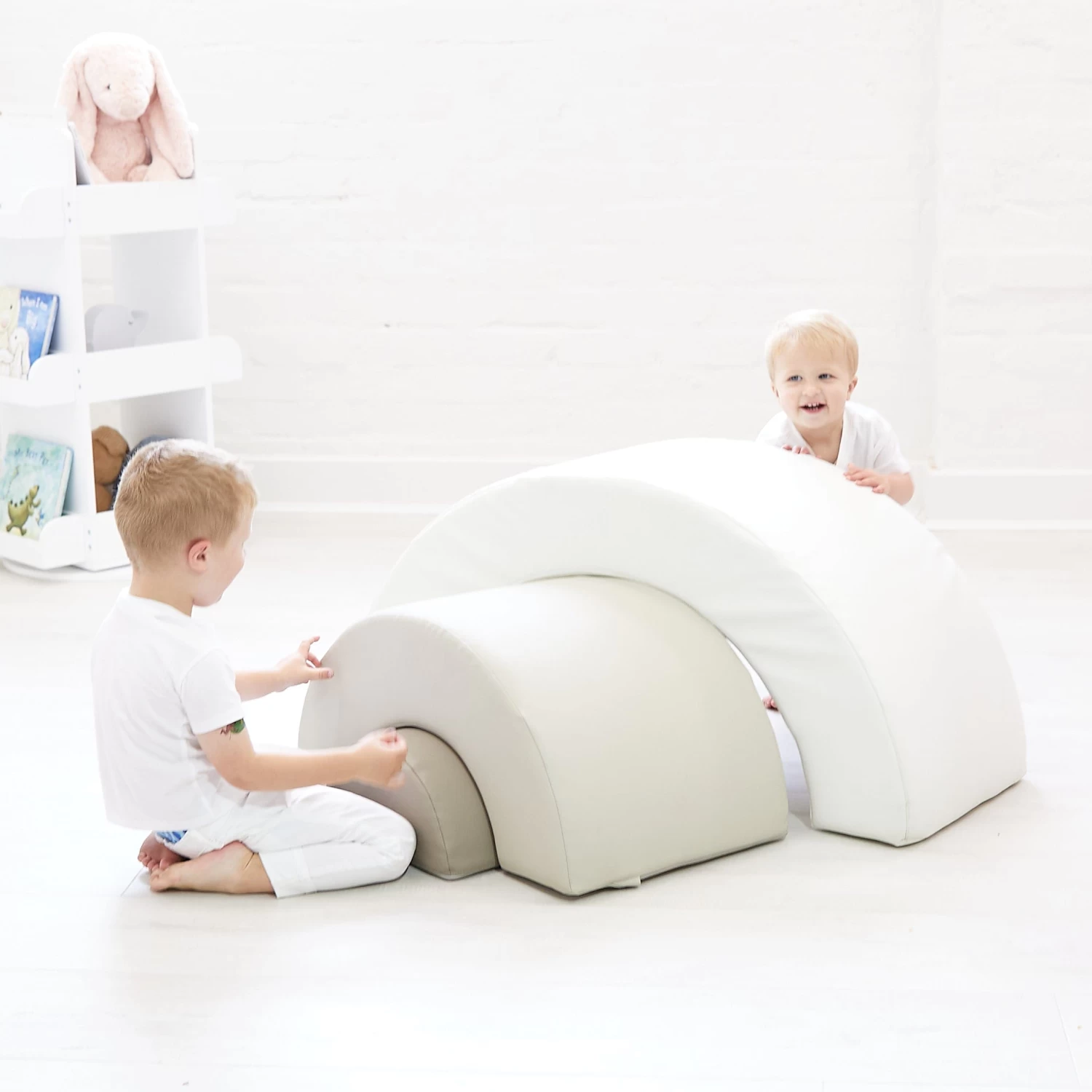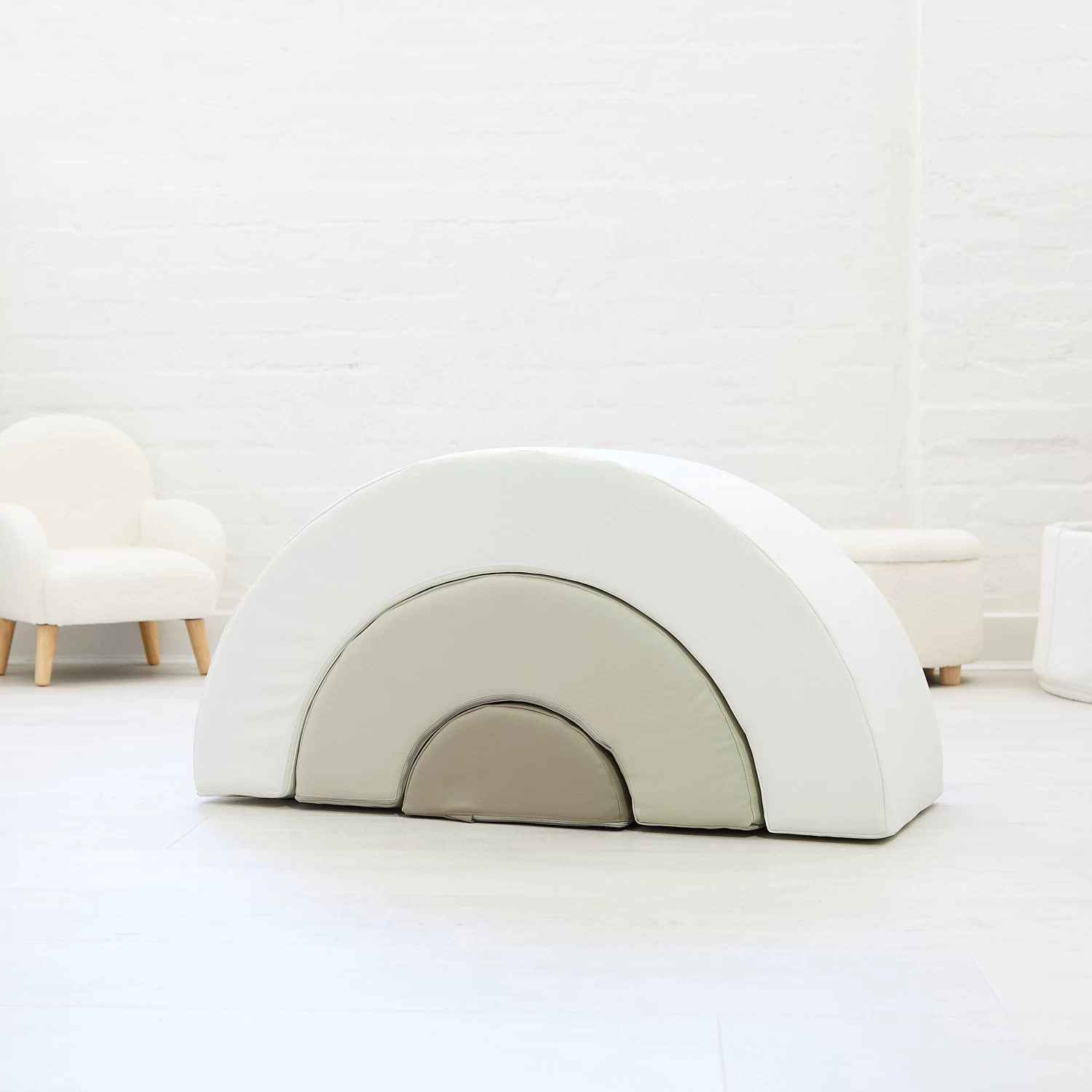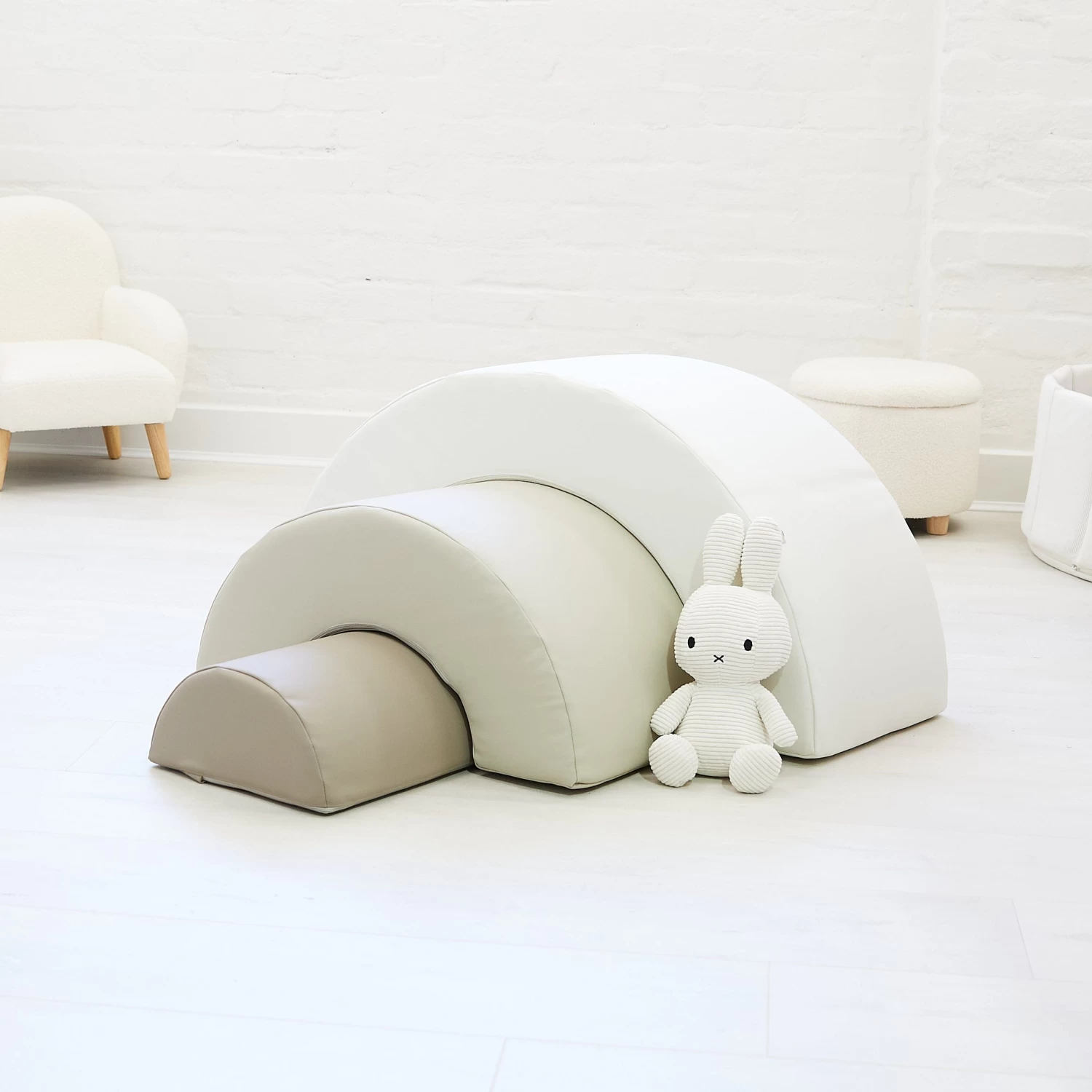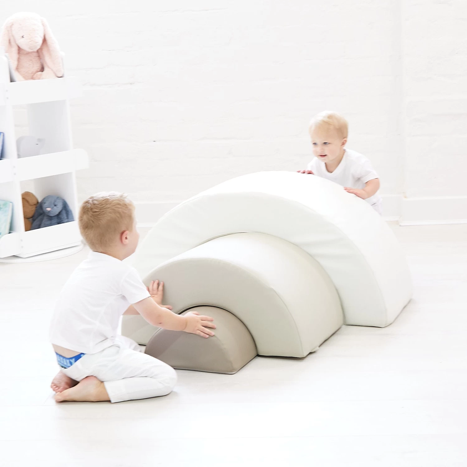 Velcro strips hold the 3 x base pieces securely in place. The lightweight foam pieces are covered in high quality PVC. They are durable, lightweight and easy to move around and easy to clean. The rainbow arch shape can be pulled apart for climbing & crawling fun and then put back together like a puzzle.