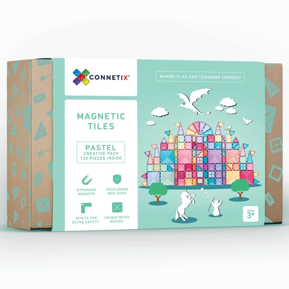 Designed to encourage hours of limitless creativity, fun and learning through play, the 120 piece Pastel Creative Pack features a variety of shapes in 8 pastel colours. It is a great starter option for family play, building bigger Connetix creations and expanding the range of colours your children recognise!