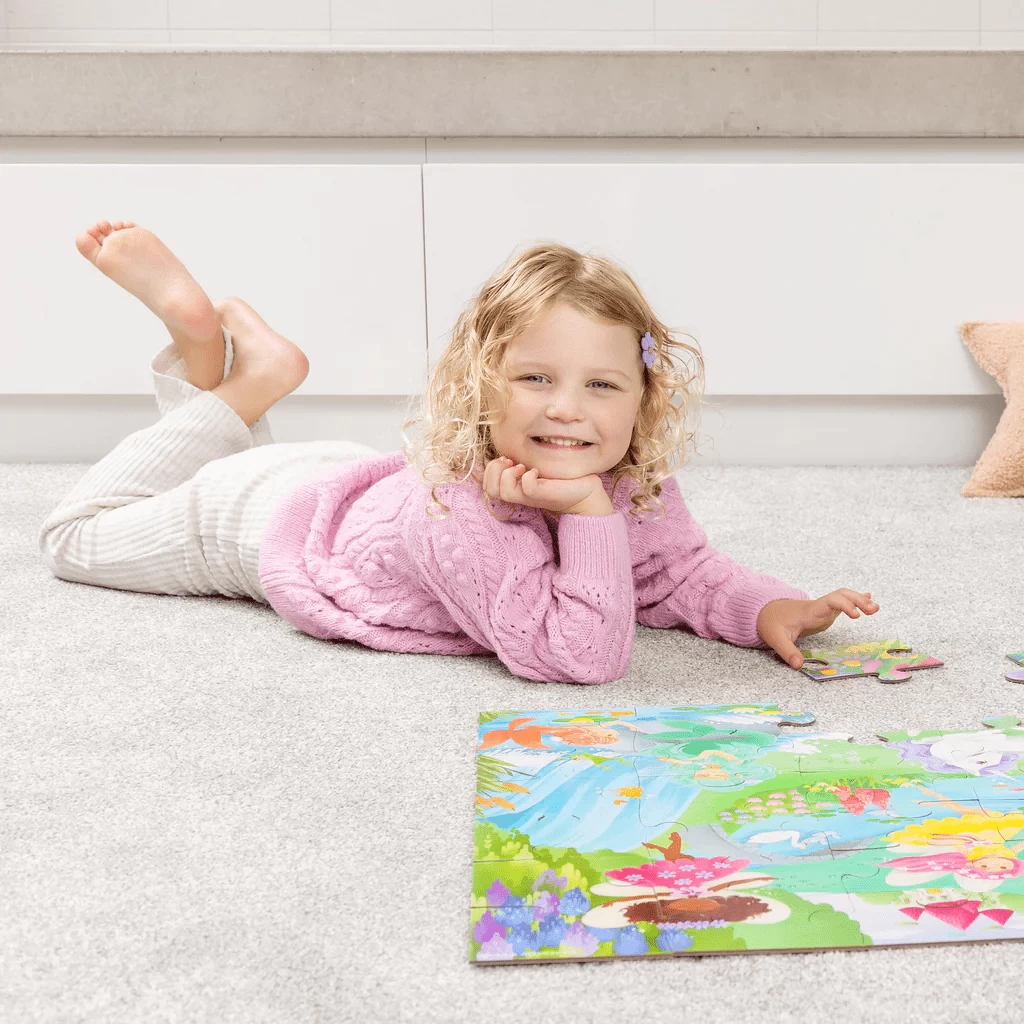 Unicorns, fairies and flowers abound in this beautifully illustrated Unicorn Forest 36-piece floor puzzle. All wrapped up in its unique contour-shaped storage box, the jumbo, sturdy pieces of this high-quality puzzle are ideal for little hands.