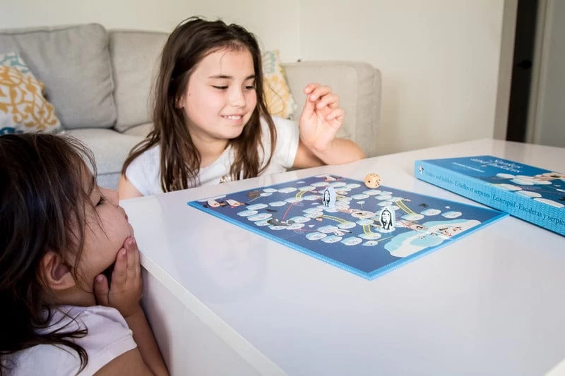 The classic snakes and ladders game with a polar themed twist. The players try to get their penguin to the igloo at the end of the board by rolling a dice and moving that number of squares. But watch out! If you end your turn on a square with a polar bear you have to follow his net all the way back to the square it touches. But its not all bad news: if you end your turn on a square with a ladder you can climb that ladder up to the square it touches. The first player to get their penguin to the Igloo at the end wins.
