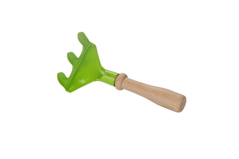 The set includes a hand rake, a hands shovel, and a hand trowel. Each instrument is made of metal and has a wooden handle.
