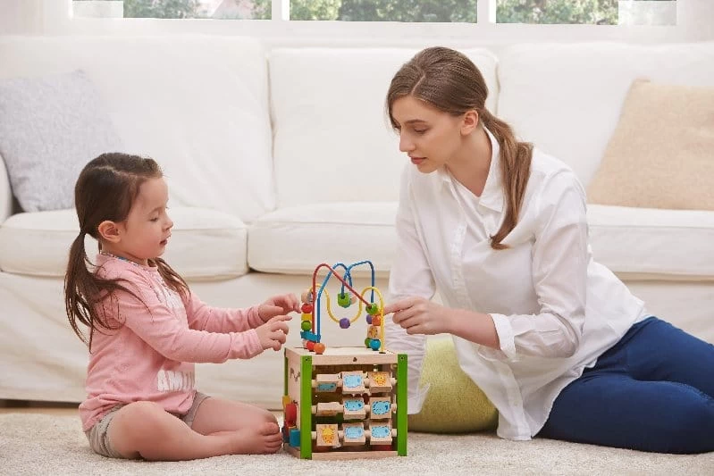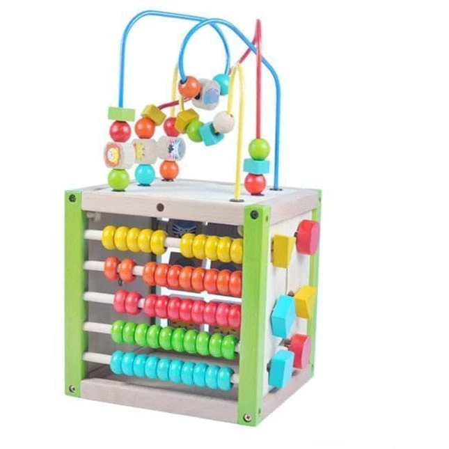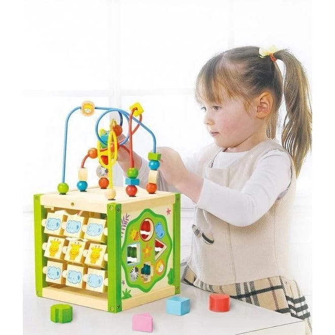 ThisMy First Multi-Play Activity Cube provideshours of joy and adventure.It includes a sliding peg board, wooden animal tic tac toe, shape sorter with bright wooden shapes and wooden bead abacus.