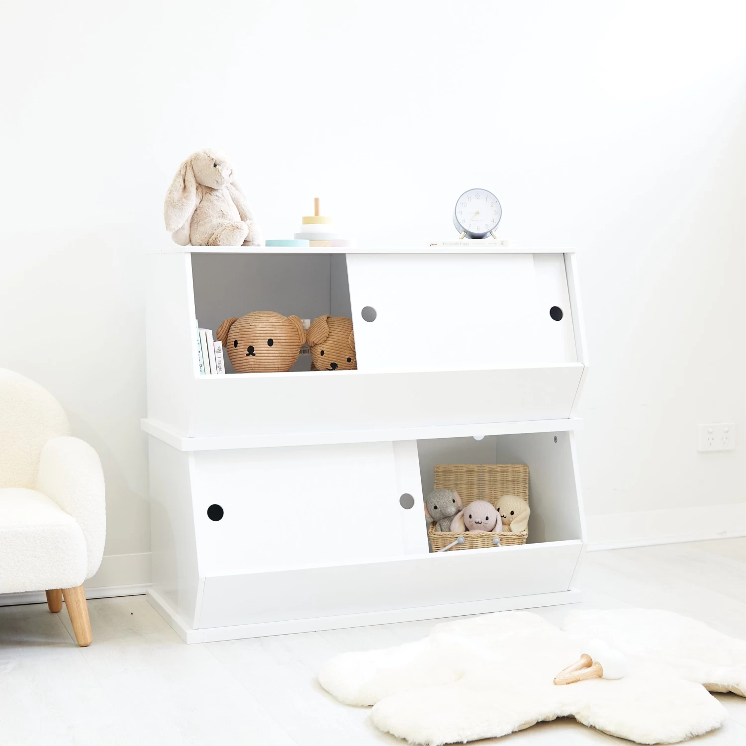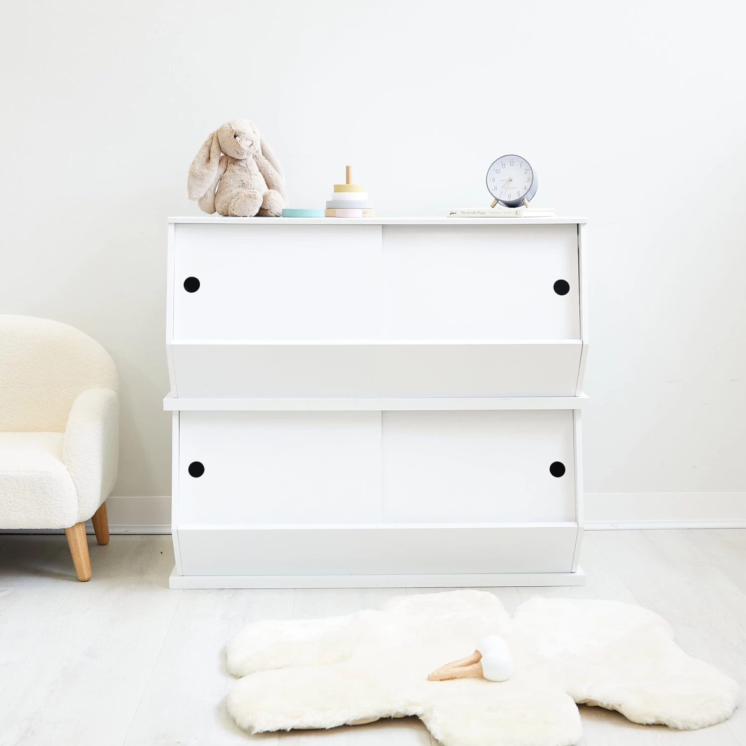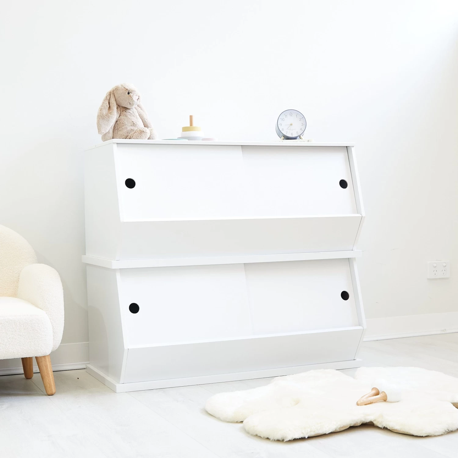 These stylish stacking bins are ideal for use in playrooms, bedrooms, study or garages for storing toys, books, games, shoes or anything you fancy. Complete with sliding doors to keep toys and books concealed.