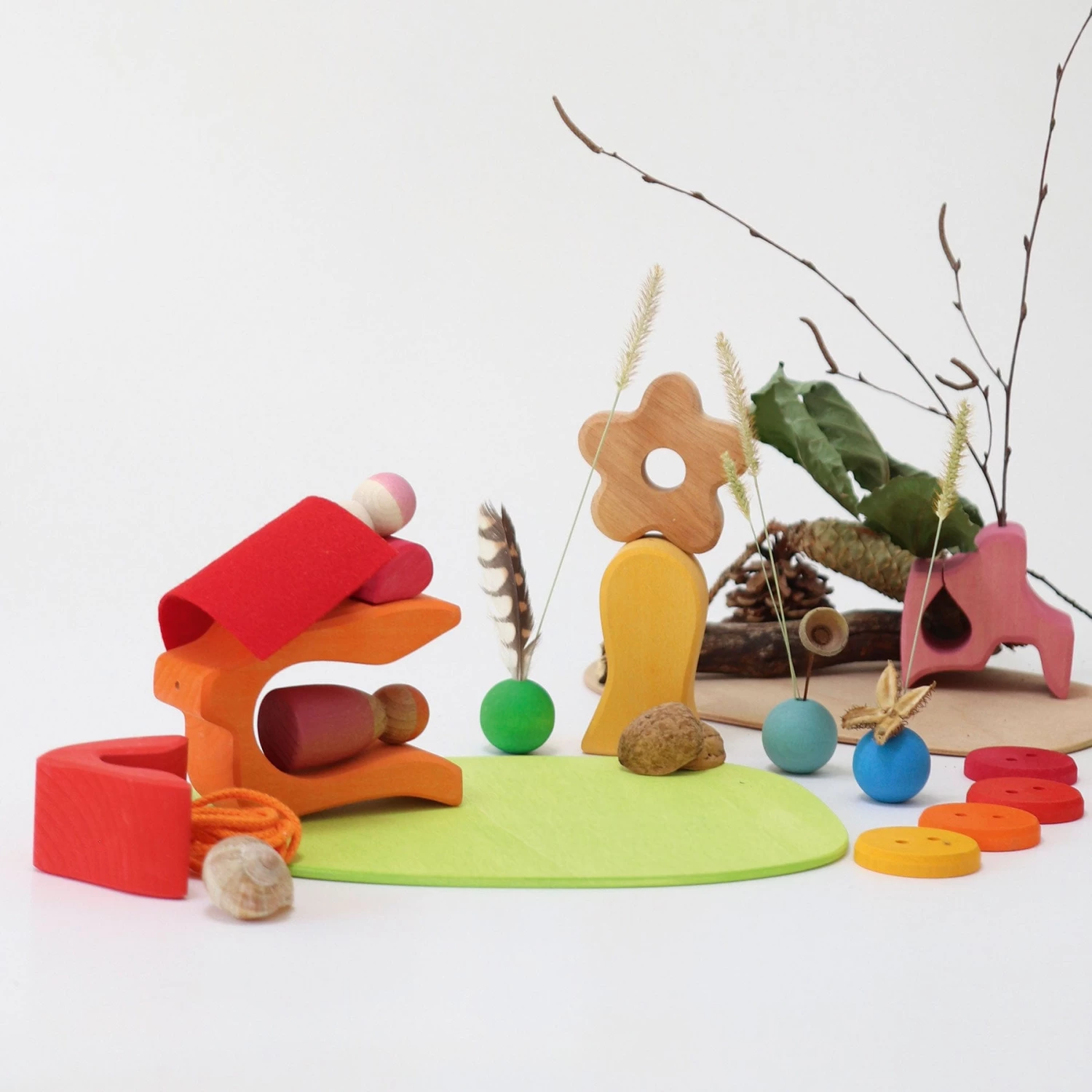The magical flower tower in the set with selected components invites individual design and transforms into a lively play world with treasures from nature. This open-ended set consists of a 5-piece cottage, 2 friends, 4 buttons, 1 flower, 4 beads, 1 string, 2 plates, 1 piece of felt.