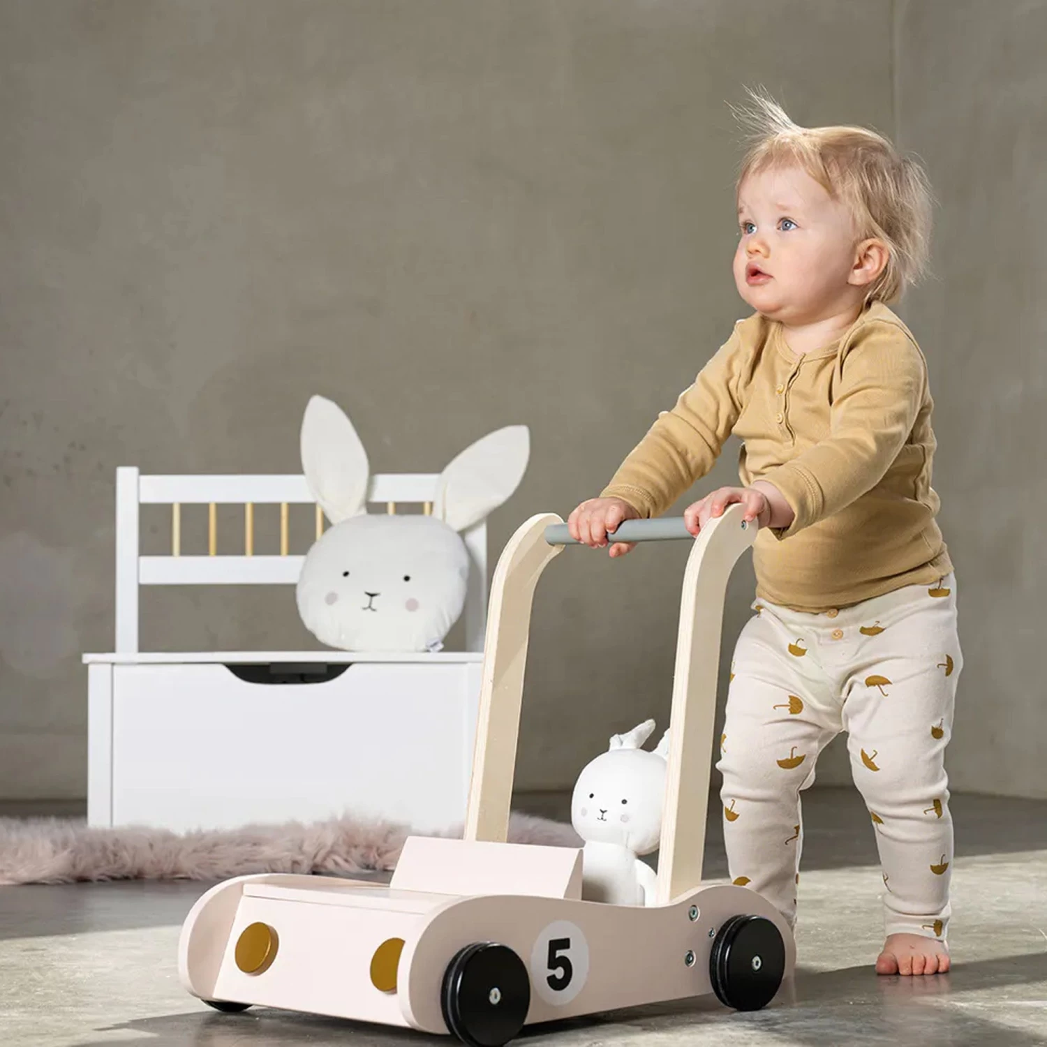 Jabadabado’s baby walker in wood is the perfect companion when you take your first steps. The walker is designed like a small car and the popular character Teddy or Bunny sits ready to follow you on every adventure. The walker provides stable and safe support even for small children who have just started walking as it has adjustable brakes on the rear wheels. There is also a smart built-in storage as the lid can be removed and underneath it you find the perfect hiding place for all your favourite toys. The soft pastel colour makes the walker a nice detail in the children’s room. The wheels have a rubber ring, so they roll safely on all surfaces without leaving marks. The baby walker will be an appreciated gift that can be played with for a long time, and it is perfect as a baptism gift or for the first birthday.