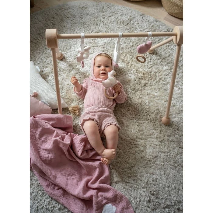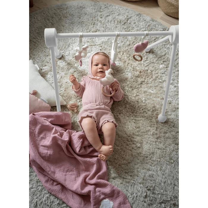 Adorable soft baby gym toys, including a heart, a swan and a unicorn. The heart is playing a lullaby and the swan has a rattle inside making interesting sound for the little baby. The inviting shapes and colors will keep your baby entertained and stimulating development of visual and motor skills. Toys have long loops for easy attaching to a baby gym or most cribs and carriers for on-the-go fun. Wash by hand. Made of finest muslin and filling polyester fiber.