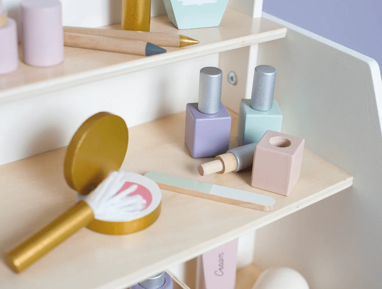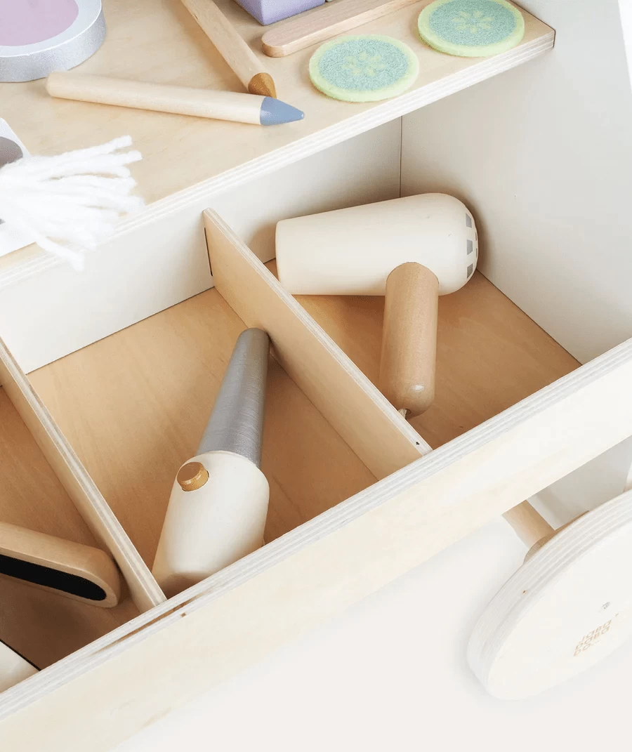 Jabadabado’s wooden beauty salon is filled with everything you need to open your own salon at home. Allow the customers to sit comfortably in a chair and enjoy the treatment. Help the customers with their makeup before the party. Start by adding the cucumber slices on their eyes and apply a layer of face cream before you start with the makeup. Apply a layer of foundation and blush. What colour do you want for lipstick and eye shadow? You get the finishing touch by applying mascara and kajal around the customer’s eyes. When the makeup is done, it’s time to take care of the hair. Style their hair in the most imaginative ways using a hairdryer, flat iron or curling iron before finishing with a little fixing hairspray. Of course, the visit ends with an exclusive perfume. When you have finished the treatment, the customer can have a look in the mirror to see the beautiful result.