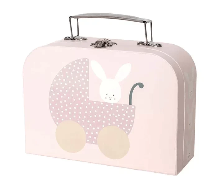 Cute baby bag with a cute bunny for all small children who like animals. The bunny comes in a practical cardboard bag in pink with a lot of fun accessories. Now you can take care of your little bunny almost as if it were a real little baby. You can put on the bib and feed it with gruel and then maybe change the diaper. When it’s time for the little bunny to sleep, there is a cute pacifier that helps it sleep extra well.
