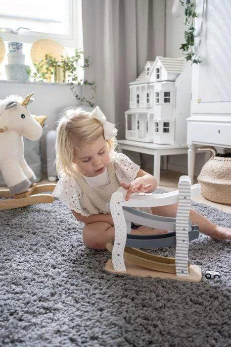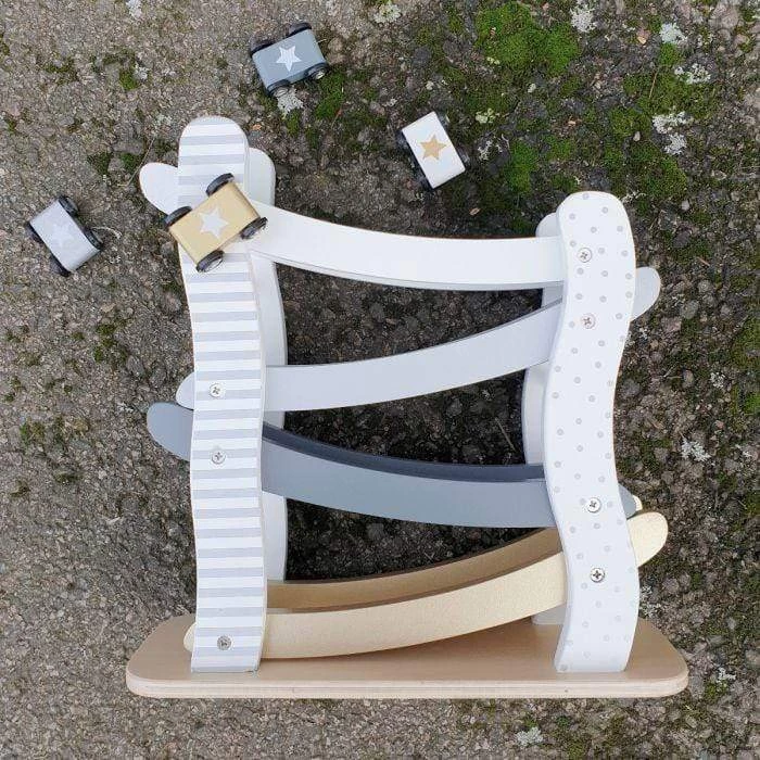 A creative and fun ramp racer for small children. Let the cars go at the top of the race track and see how they quickly race all the way down.