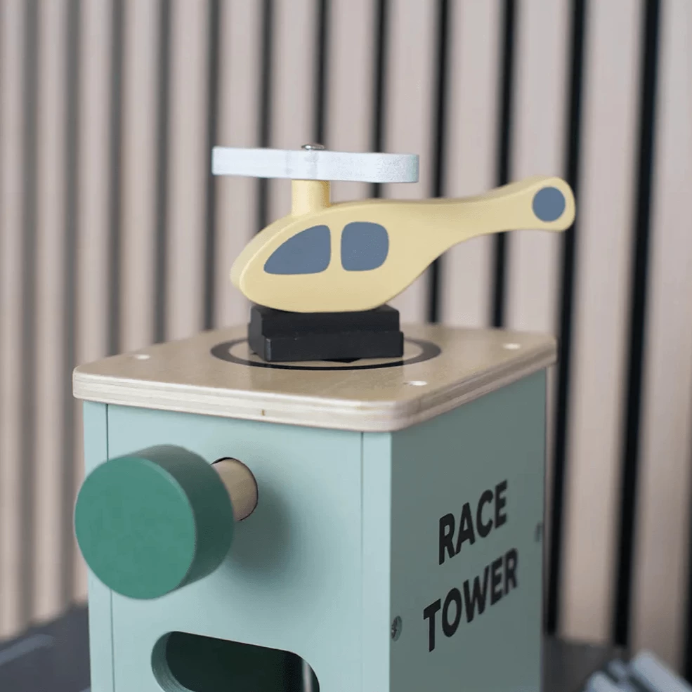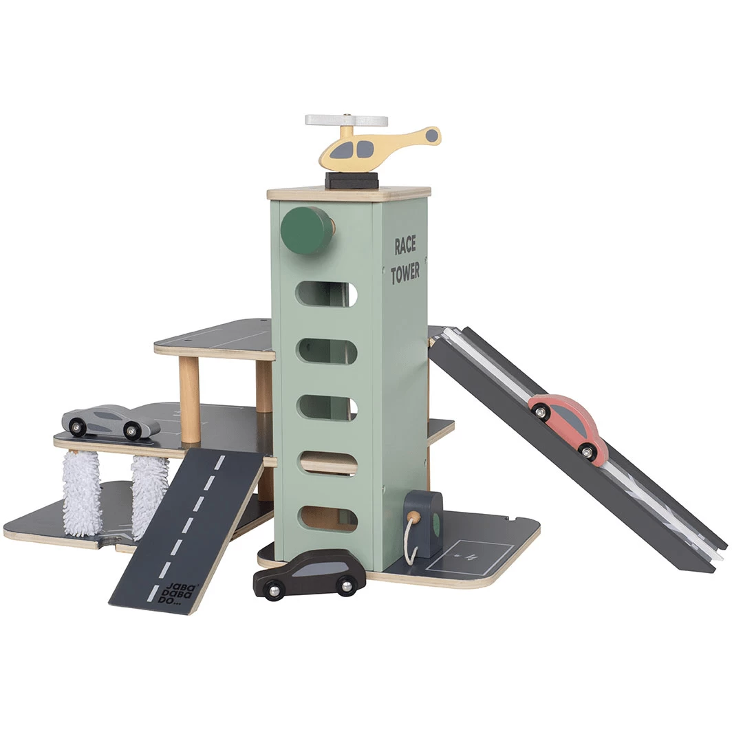 Jabadabado’s cool and fast-paced wooden parking garage offers plenty of play opportunities for all car-crazy kids. Race against your friends on the ramp where two cars can drive side by side. Who is winning? Then, continue the drive to refuel or charge the electric car and take the lift back up again. If the cars have become dirty along the way, you quickly take a trip past the car wash. Then start the helicopter, fly over the city, and land it on the helipad on the roof of the garage. The garage has three floors that you can drive between with the cars. You park in the three parking lots when it’s time to take a break. The elevator is controlled with a small steering wheel, which means that the cars can be transported to the different floors in a simple and fun way.