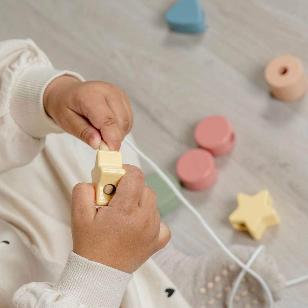 Lacing beads. Wooden beads with string is an excellent toy to support children’s development of fine motor skills, dexterity and hand-eye coordination. Its construction is specifically designed to encourage children to identify shapes and colors. The beads and string are designed to make it easy for children to thread the beads onto the string, which not only promotes creativity but also develops their artistic skills.