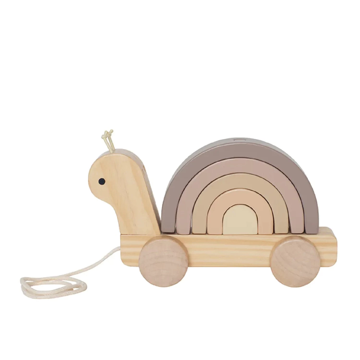 Cute wooden pull snail with a stackable rainbow on its back. The perfect company when the child takes its first exploratory walks. The rainbow on the snail’s back can be played with separately or as a stacking toy. Why not use the rainbow parts to build exciting tunnels or bridges for your favourite car. Only the child’s imagination sets the limits. The rainbow consists of five separate parts. Encourages creative playing.