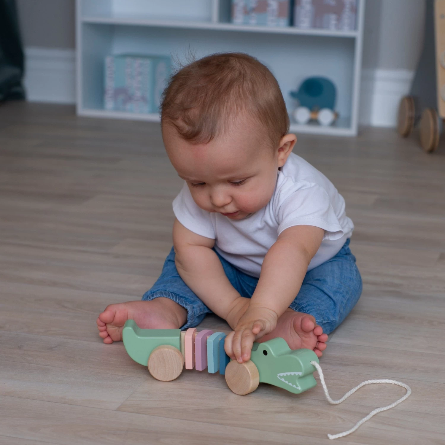 A classic wooden pull-along toy shaped like a cool green crocodile. Your little one will love strolling around the house with his/her new little pet. The crocodile will happily accompany your little one on all exciting adventures. The pull-toy features sturdy wooden wheels that makes it easy to pull. It will help the child develop balance and hand-eye coordination.
