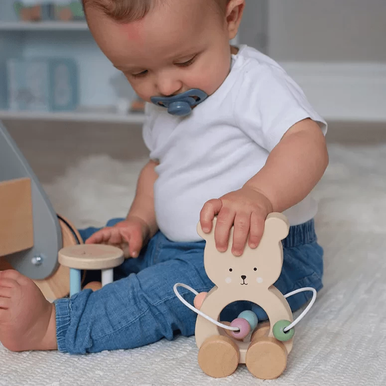 Push animal in solid wood, shaped like a teddy. With wheels as feet, the little animal is easily rolled over carpets and anywhere at home. The teddy also has an abacus around its body with 5 marbles in different colours. A perfect 1 years gift.ct 1 years gift.