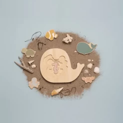 A fun wooden puzzle in different layers. Six different sea figures make up the puzzle pieces. The figures are shaped to fit into small hands and are easy to grab. A fun and challenging way to puzzle.
