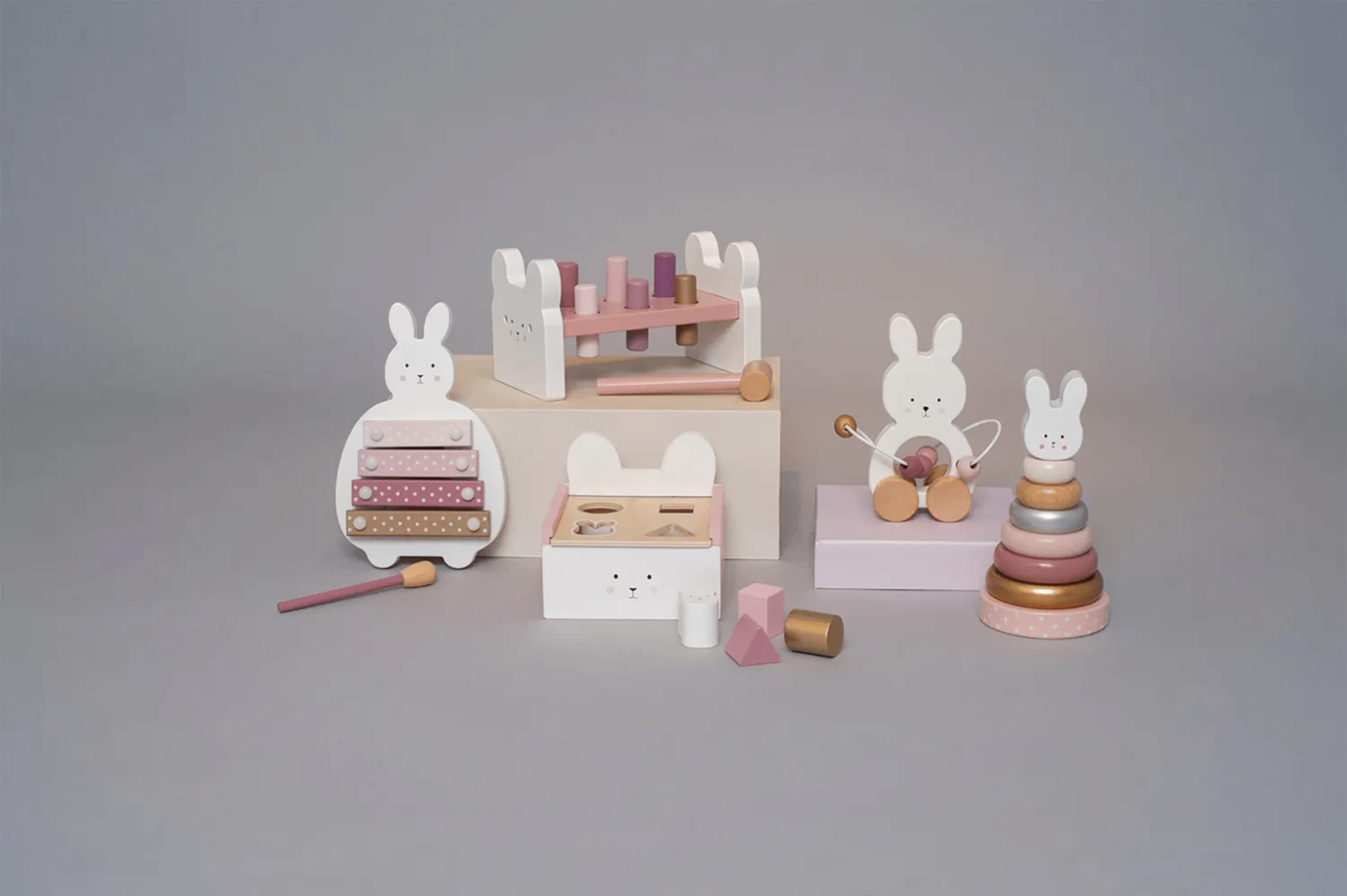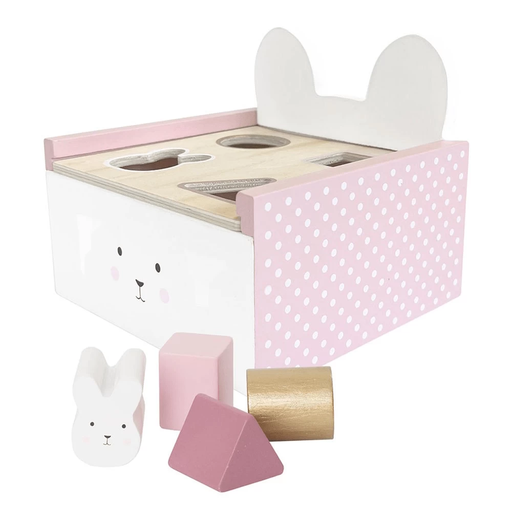 Sorting boxes help children to train their fine motor skills and learn the difference between different shapes and colours. Sorting box in soft colours. The sorting box contains a removable cover and four different shapes; triangle, bunny, cube and cylinder in four different colours to fit into the different holes. With this box, your child learns that there are both different colours and shapes.
