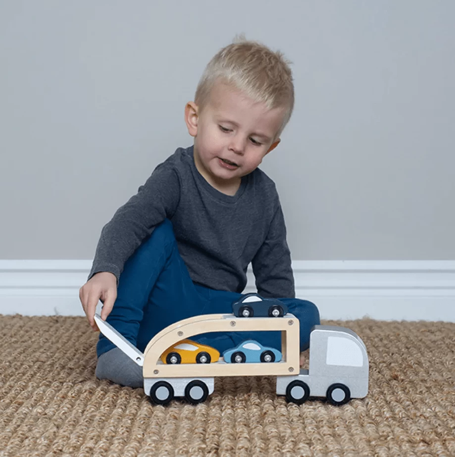 Pedal to the metal! This cool trailer is a must for any car crazy kid. The trailer has three cars and two decks where you load your cars and easily transport them to the garage. The trailer is detachable so you can drive around only with the trailer.