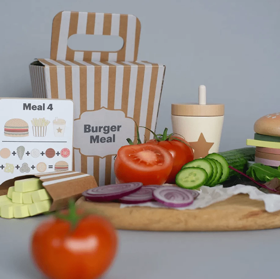 A complete hamburger meal for the little hungry one. With our imaginative burger meal, you can serve several tasty meals inspired by the included menu cards. The burger is stackable, and the child chooses for himself which goodies to include in each menu. Four menu cards suggest different combinations of the burger, the fries, and the accompanying drink. Only the child’s imagination sets the limits. Encourages creative playing.