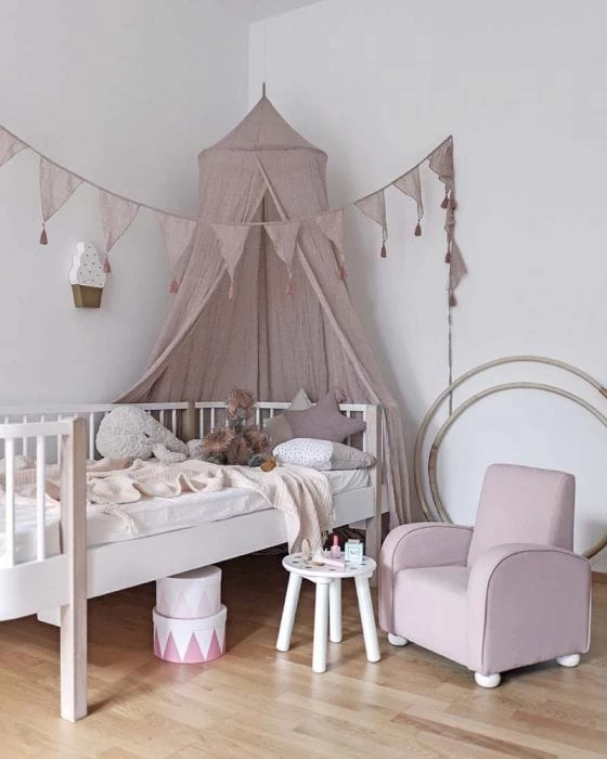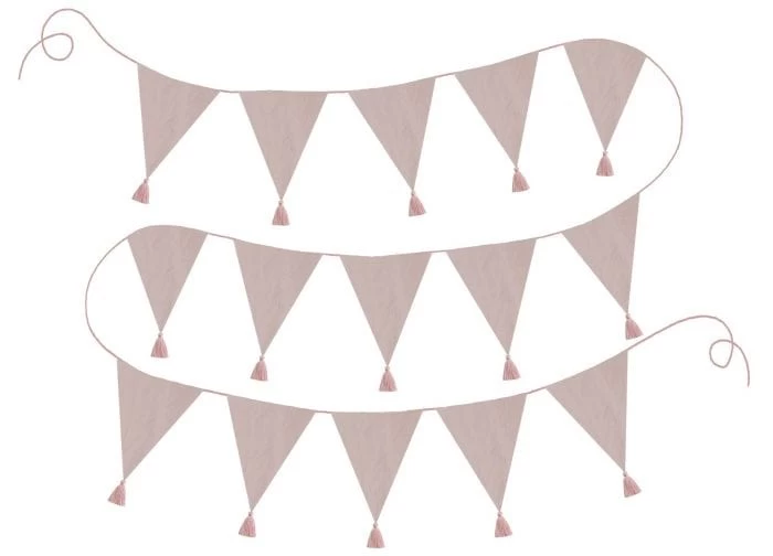 Textile bunting 4 metres, in a pastel-colour with tassels. The textile bunting works as a nice interior item in the children’s room, hanging on the wall, over the bed or along a canopy.