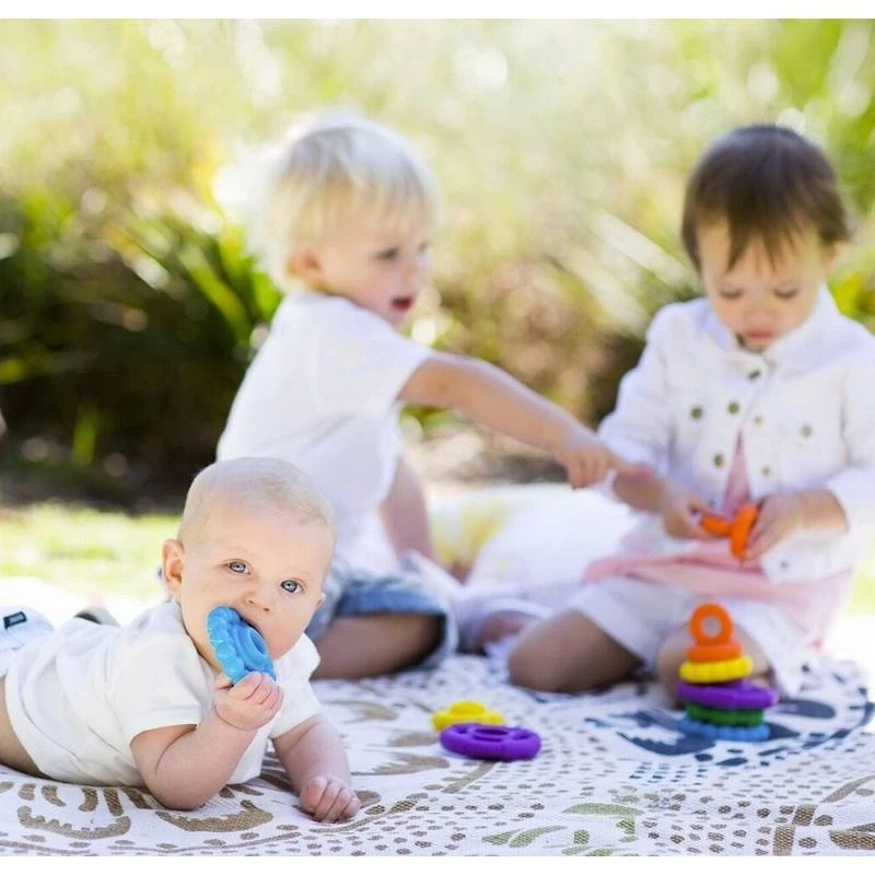 This baby toy comprises 5 different shapes featuring different textures and colours for a variety of sensory stimulation. Baby can grasp at the individual layers of the stacker, and each layer can be stacked and are light enough to be picked up even by small hands.