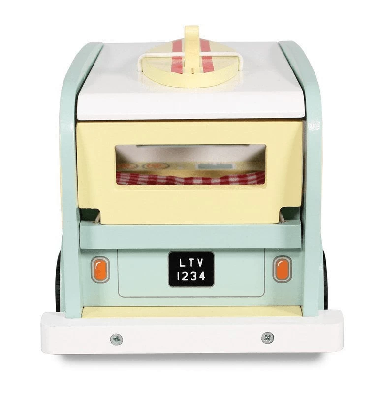 A vintage wooden holiday campervan. Features a classic detachable surf board. Lift off the roof to reveal a bed with padded mattress and kitchenette area