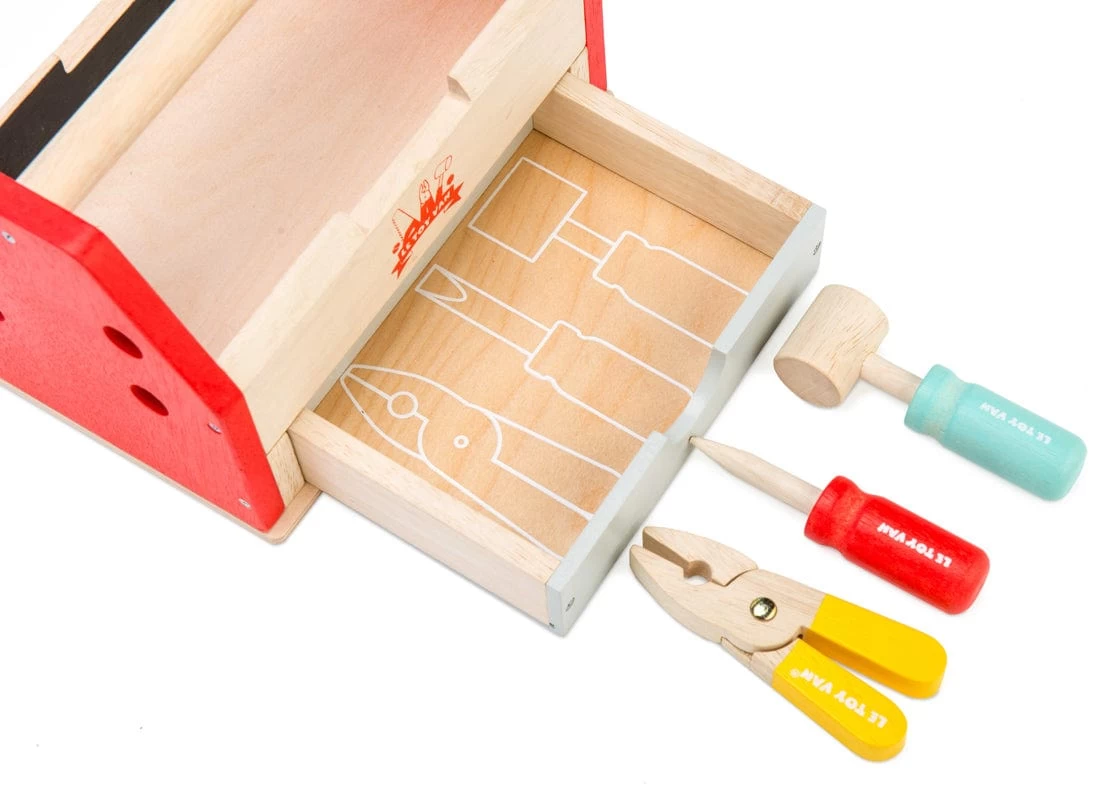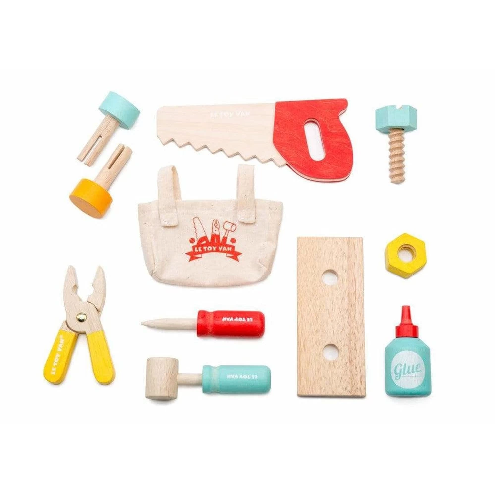 This comprehensive tool box comes with 11 accessories for role play and skill development. It contains a saw, pliers, screw driver, plank of wood, two nails, bolt, screw,glue pot,fabric bag and a hammer.