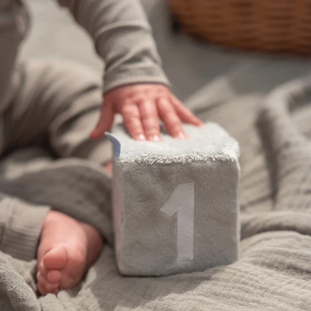 Your child’s hand-eye coordination is stimulated in a playful way. The set consists of 4 sensory blocks, each defined by soft colors and a unique number. Baby hands will also discover fun labels, plush panels, and a sunny mirror.