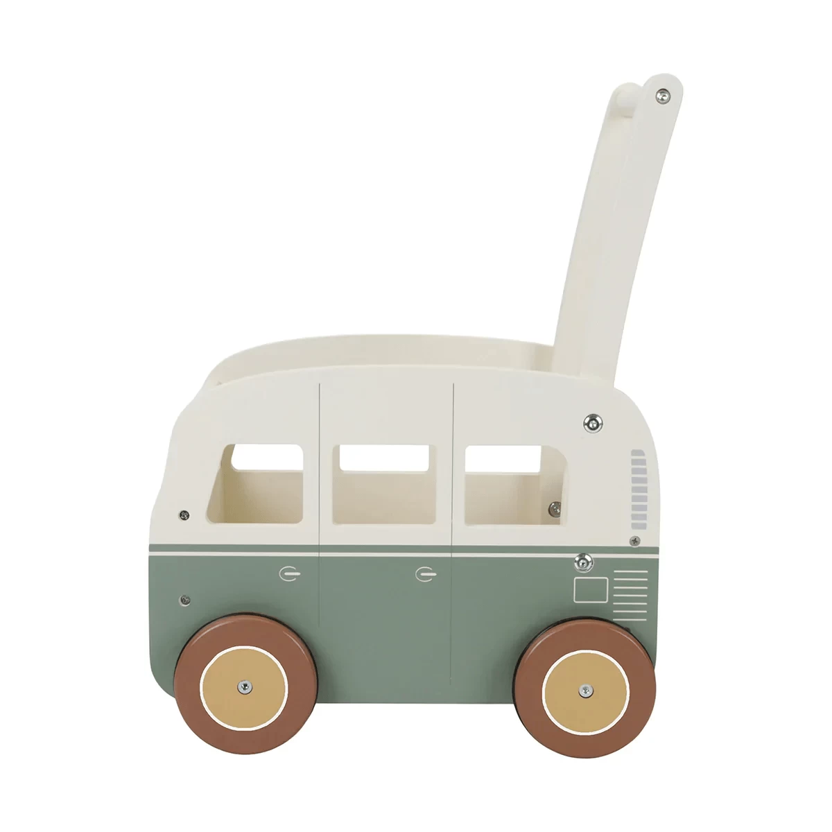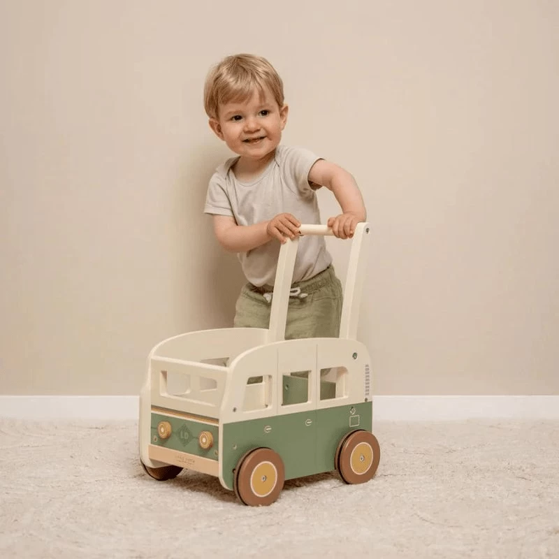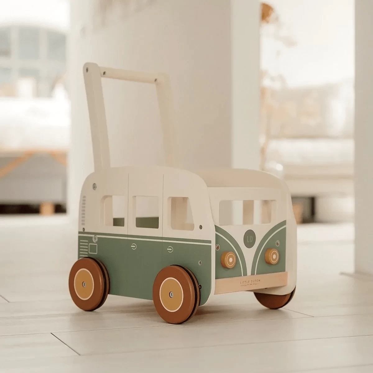 And off you go! On adventure throughout the living room with this Vintage walker wagon. Step by step you learn how to walk, and this push wagon will help you get there. So start your engine and imagine being the driver of this supercool van. The wooden Vintage walker wagon is not just a helper to watch your beginner walker flourish. The timeless design of a vintage surfer van is also the perfect toy box for your baby. Your little one can store toys for imaginative play indoors or bring them with on walking adventures! Great for development of balance, coordination and motor skills. And thanks to the rubber strips you will not have to worry about your floor when your child is cruising through the room.