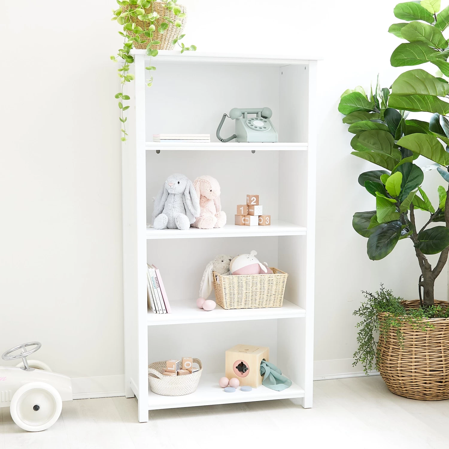 This tall storage unit can be styled with books, toys or keepsakes and is a terrific bookshelf for the bedroom, or playroom.