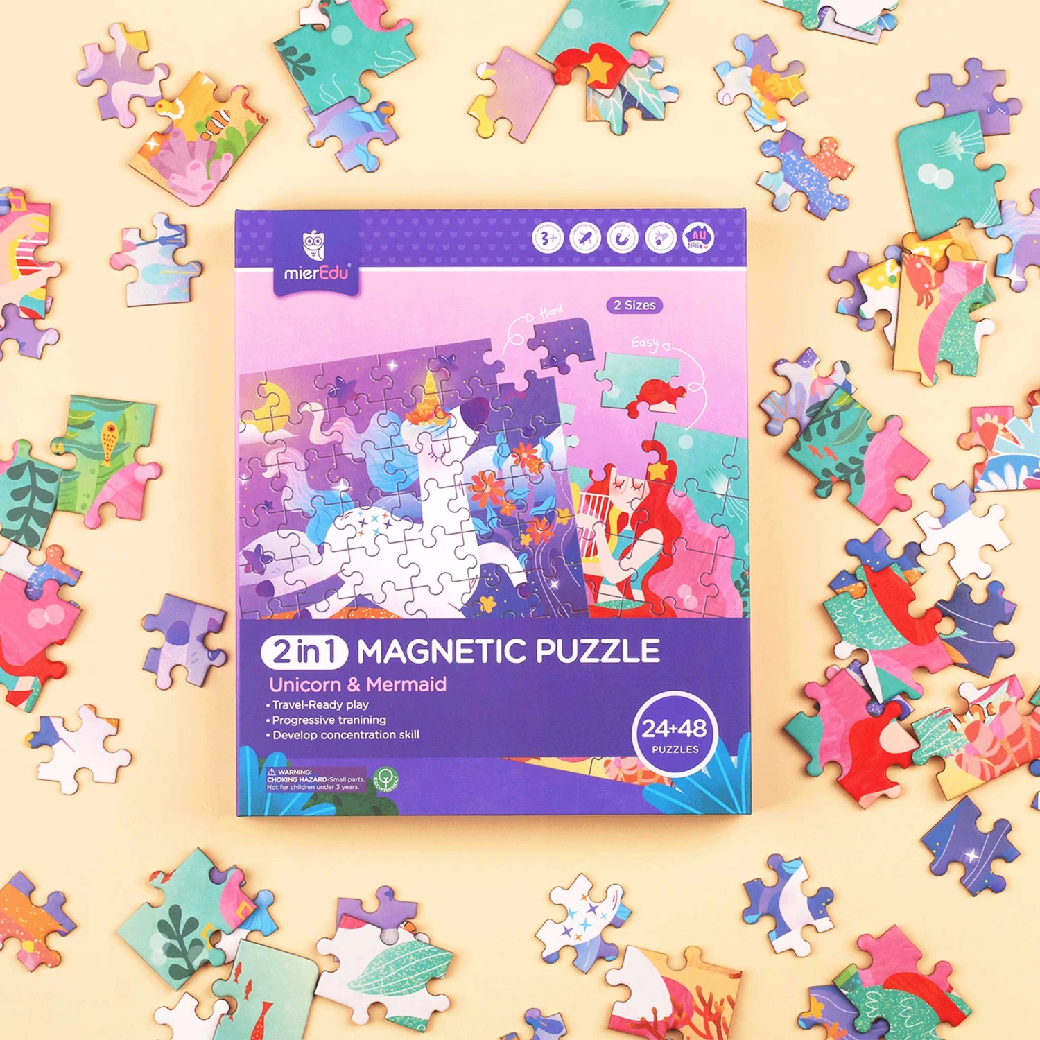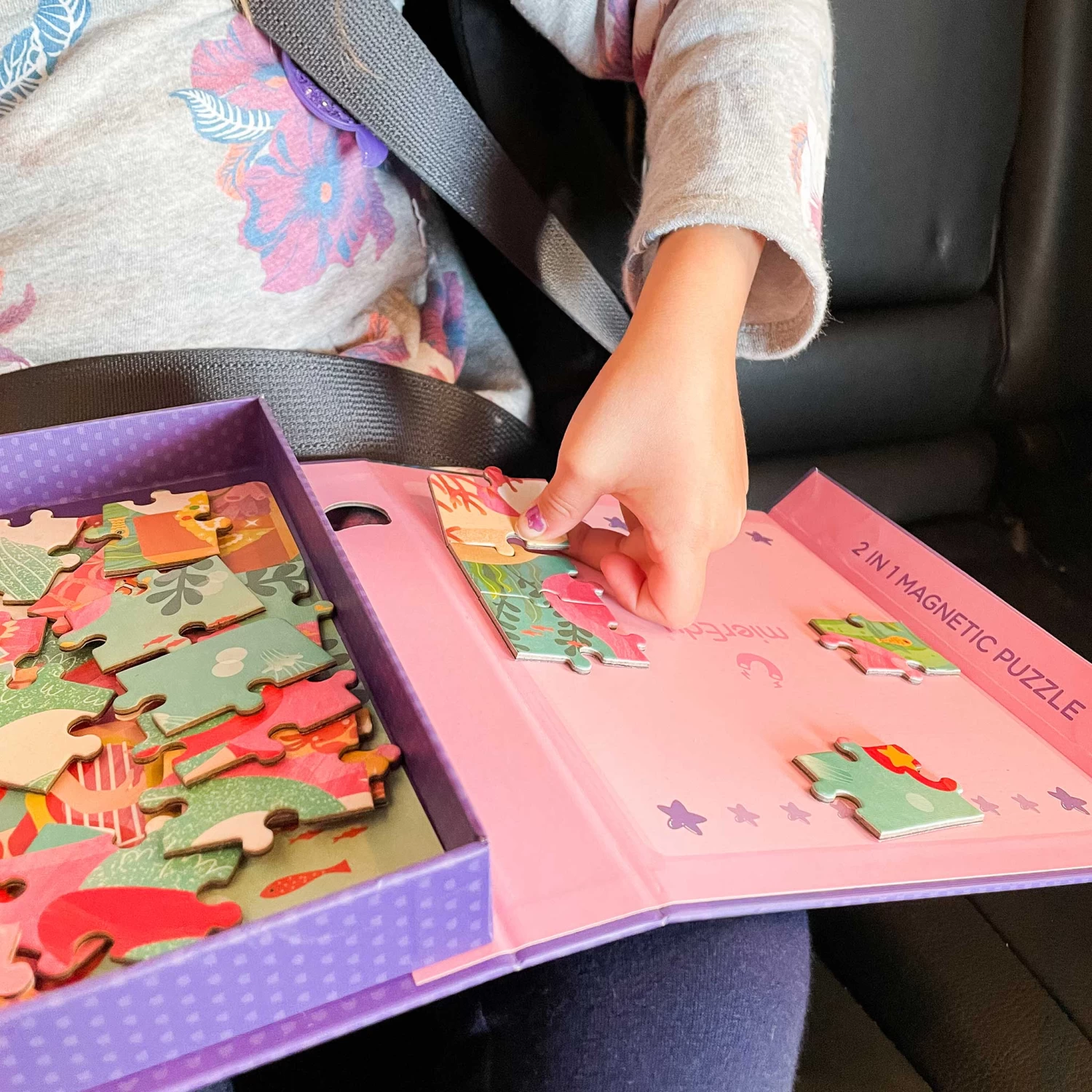 This portable 2 in 1 magnetic puzzle set features progressively challenging gameplay designed to guide young children from focus to big picture thinking, as well as develop concentration through careful observation and judgement whole honing important hand eye coordination skills. Magnetic jigsaw puzzles are suitable for age 3+ to explore and solve.
