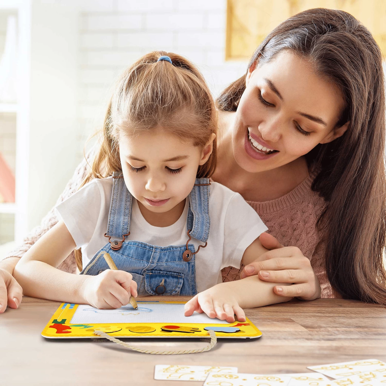- Include: 1 draing board | 20 step-by-step cards | 4 stencils | 4 magnetic stamps | 1 wooden pencil