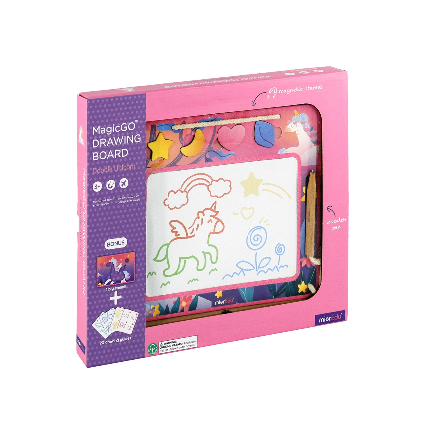 - Include: 1 draing board | 20 step-by-step cards | 1 big stencil | 4 magnetic stamps | 1 wooden pencil
