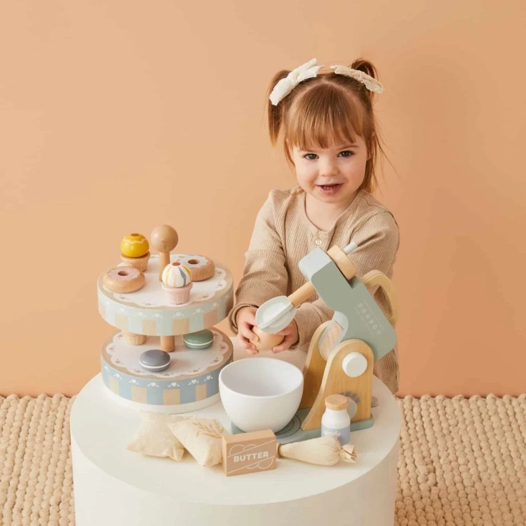 With movable knobs and and an upper section that you can lift and move down just like a real mixer, little ones will love this adorable Mixer Set! Complete with wooden baking ingredients such as an egg, butter, milk and more, their imagination will go wild with what they can bake! This set also includes a spatula and a piping bag.