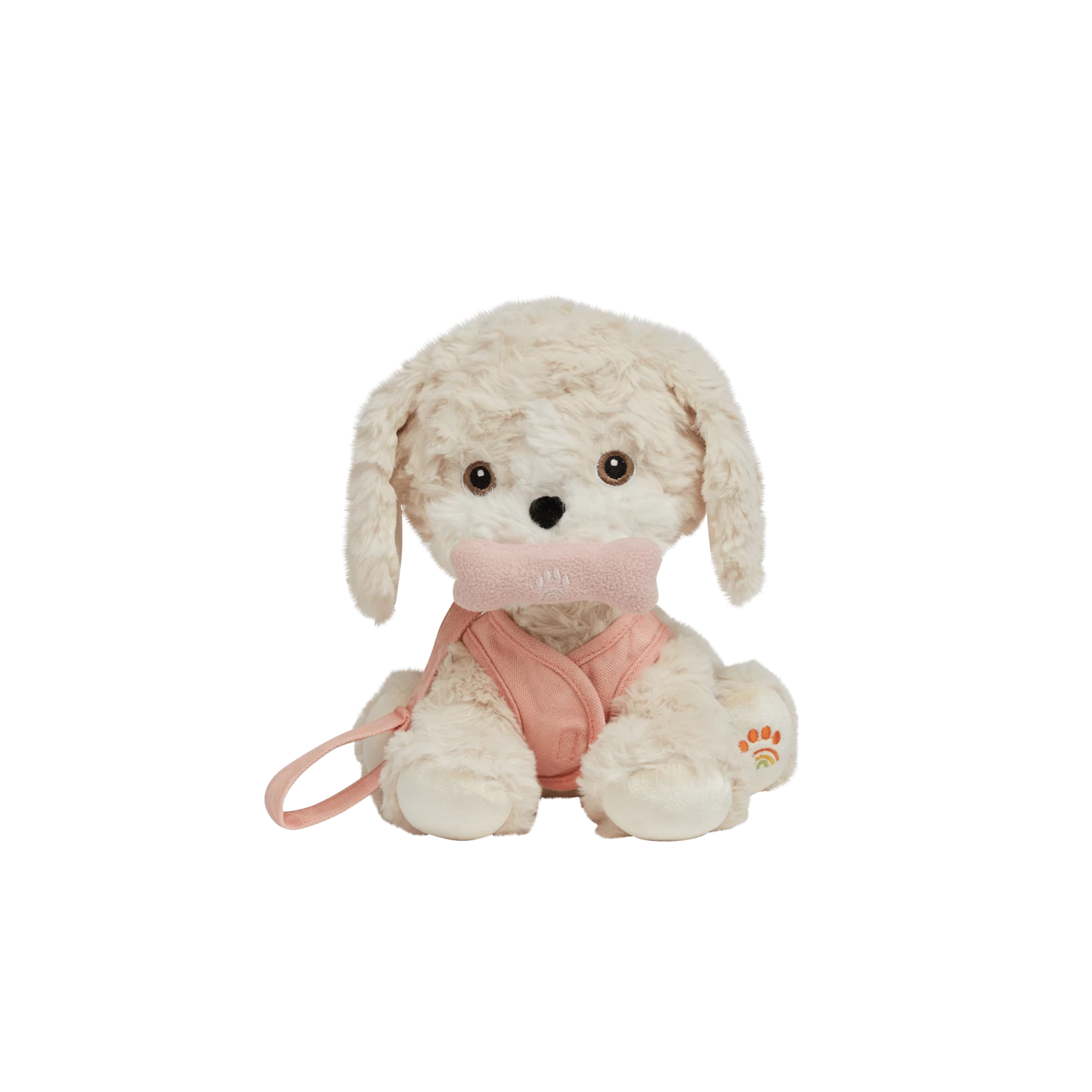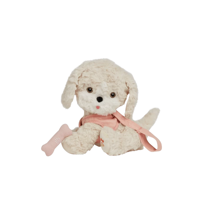 Cookie needs lots of love to keep that tail wagging and plenty of Dinkum Doll walks! Made from soft recycled plush fabric with tactile curls and velvety ears to snuggle, Cookie is fully poseable and can stand, lay down, and even sit! Cookie’s head moves and is embroidered with the sweetest doggy face, plus there’s a rainbow surprise on one of Cookie ‘s little paws!