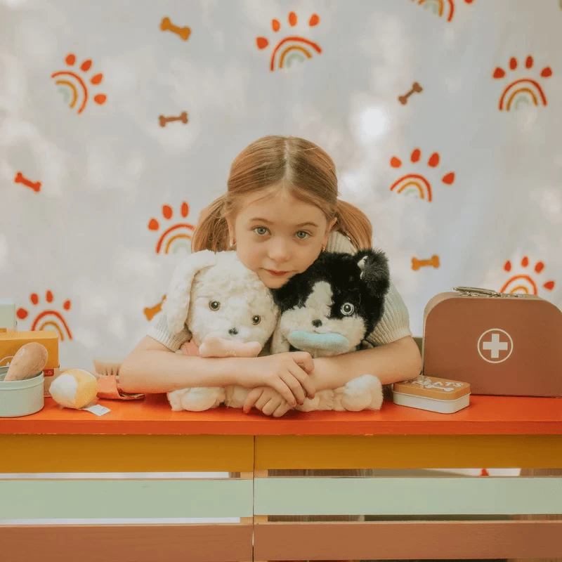 Made from soft recycled plush fabric with velvety ears to snuggle, Lucky is fully poseable and can stand, lay down, and even sit! Lucky’s head moves and is embroidered with the sweetest doggy face, plus there’s a rainbow surprise on one of Lucky’s little paws!
