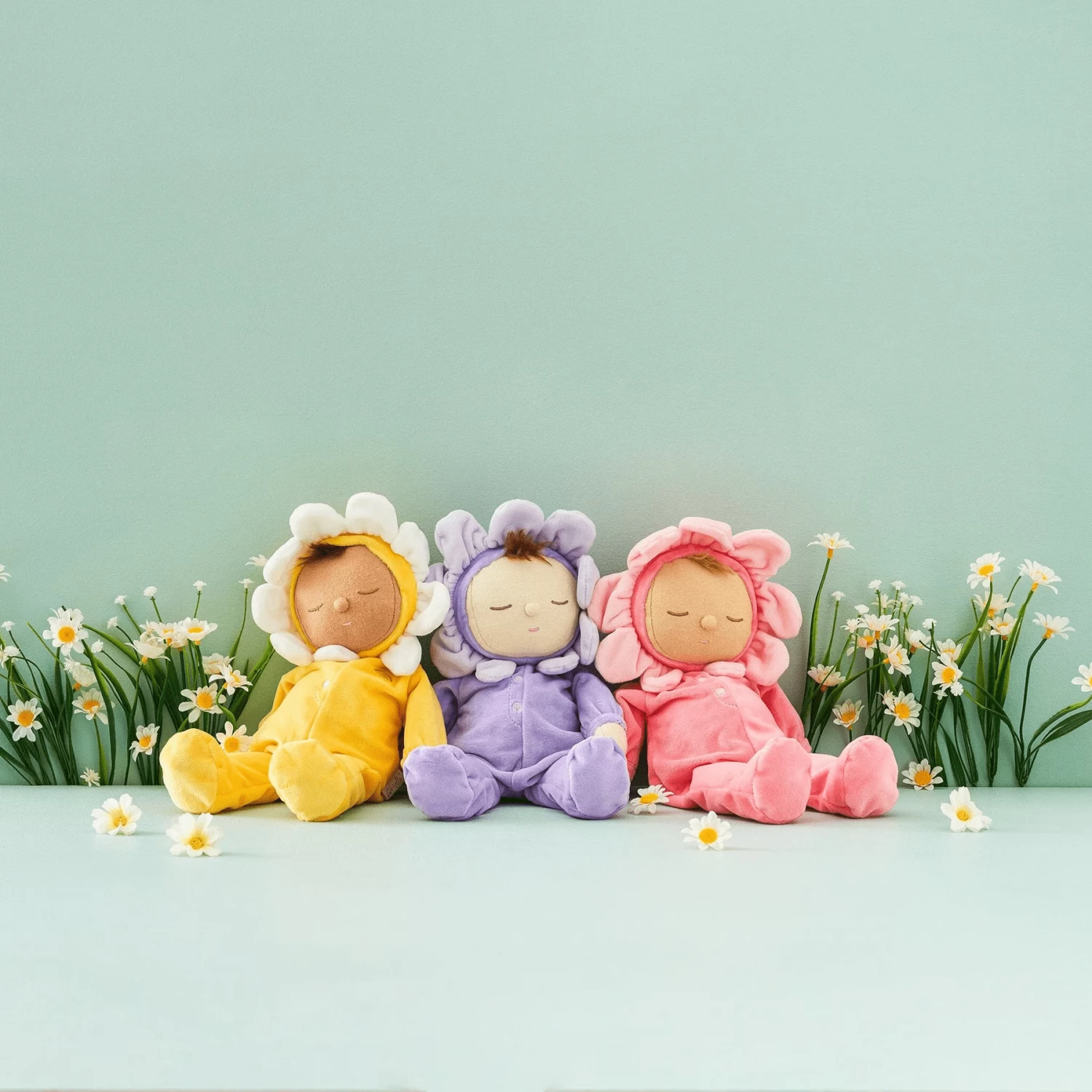 Snoozing peacefully at the bottom of the Dozy Dinkum Garden, meet baby Pickle. Perfectly weighted in all the right places and snuggled in a velvety onesie, pick your Petal Dozy and tuck them into a matching Dinkum Dolls Petal Carrier.