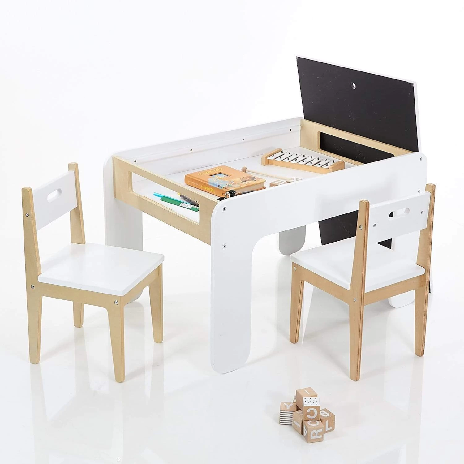 It’s two play tables in one! A removable & reversible table top – one side is painted white and the other side is a blackboard.