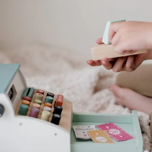 Children will enjoy ringing up all their shopping with this fun and colourful wooden cash register. Slide credit cards along the groove, pop one of 5 printed receipts into a slot, turn the little knob to show different prices through a window. Children will have fun pressing down on the multi-coloured buttons and opening the tray to dispense 5 wooden coins and 9 sheets of coloured paper money.Â