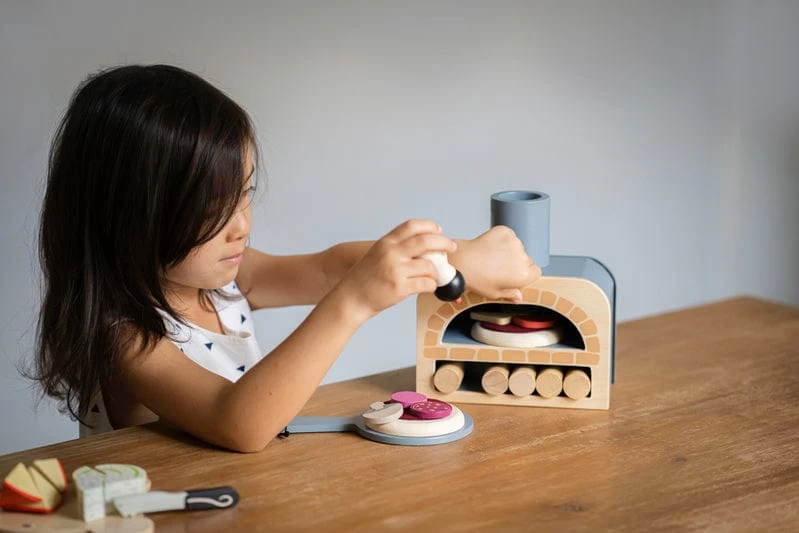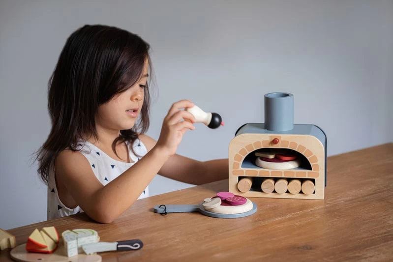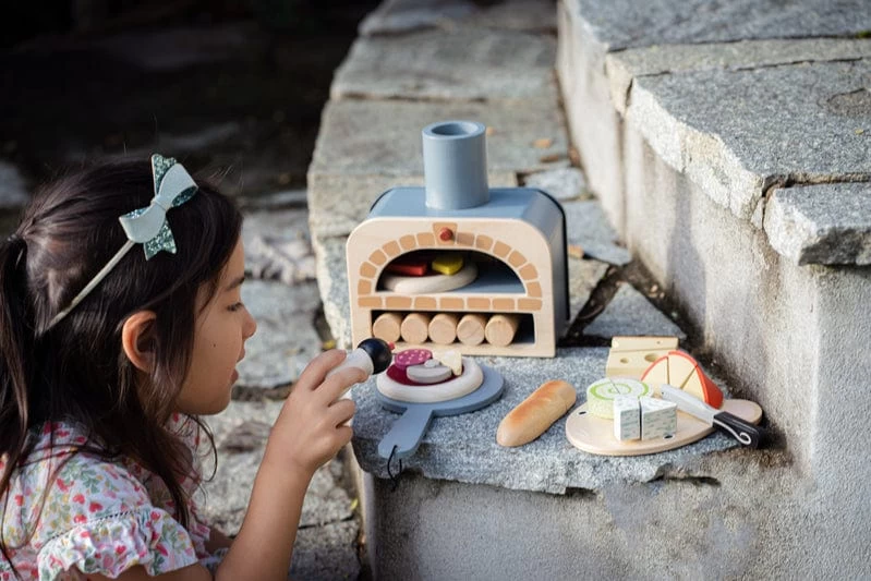 Family Pizza night just got a lot cooler with this handy pizza oven. The design features 5 logs to fire up your very own pretend play pizza oven! Make your own pizza with 6 different pizza toppings on a red felt tomato base. Pop them in the oven with the pizza slider and wait for them to cook!