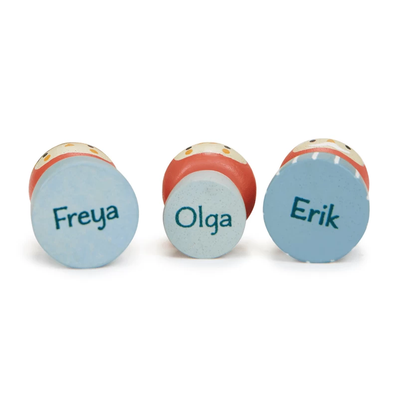 Meet Freya, Olga and Erik, 3 Nordic gnomes living in the deep in the forest. You will find them amongst the toadstools and leaves. Freya the mother looks after Olga and Erik in their leafy glade. The set comes with;