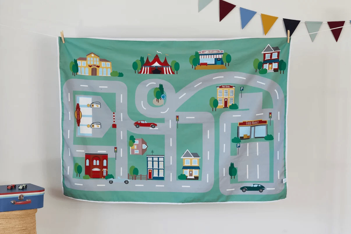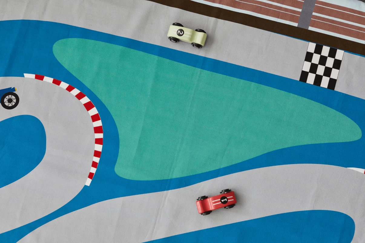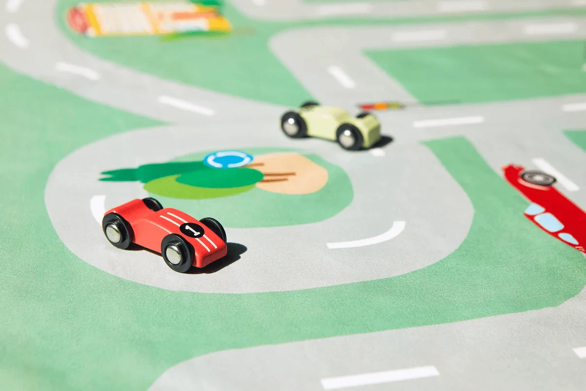 This beautifully designed 100% cotton playmat is double-sided printed (Town on one side and a Race track on the other), it comes with 2 wooden cars. The designs spark your child’s imagination to explore ideas and create stories. It is portable and lightweight and a perfect solution for busy caregivers to take everywhere.