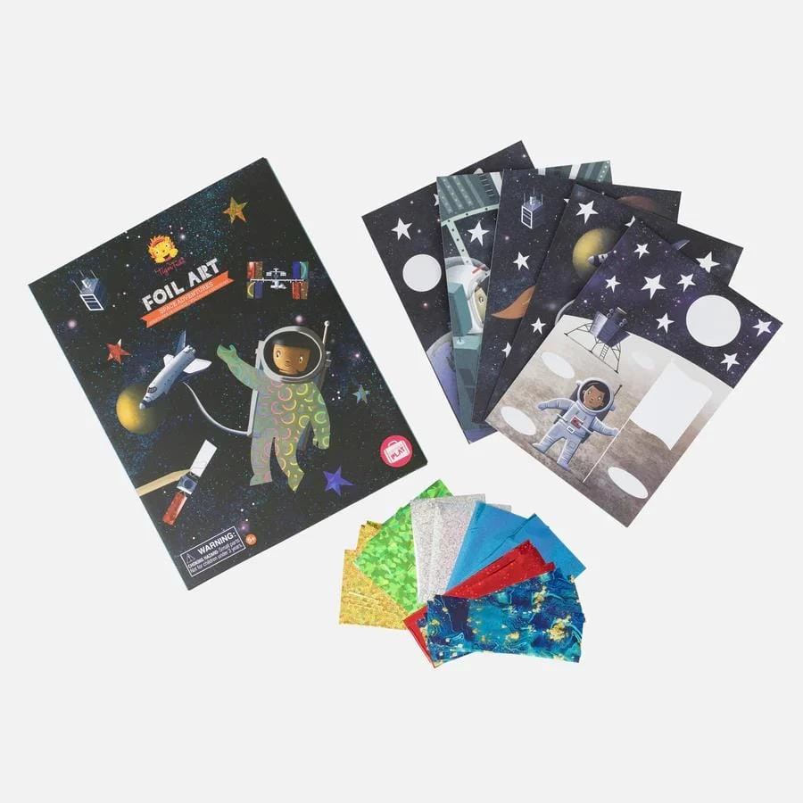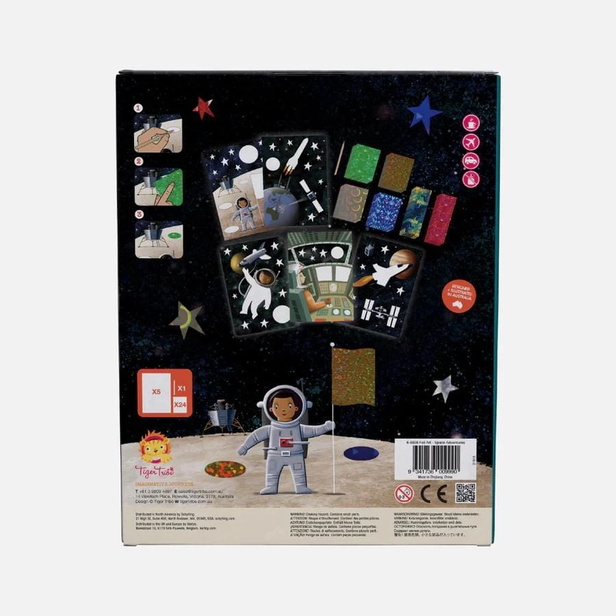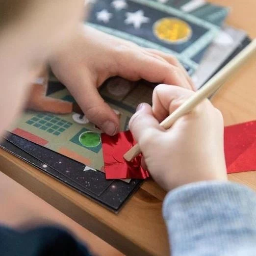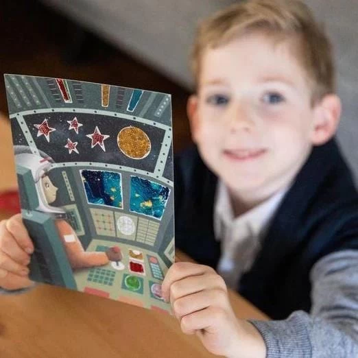Space suits, rocket ships, planets and stars are all waiting to be brought alive with a sparkling rub of holographic foil! Simply select a colour illustrated space card and use the enclosed wooden lifter to peel white sections off the picture, revealing adhesive sections. Grab a shimmering foil sheet, rub the foil onto the sticky area and voila! A beautiful shiny artwork.