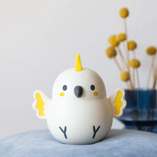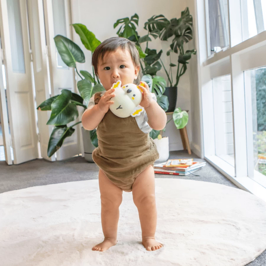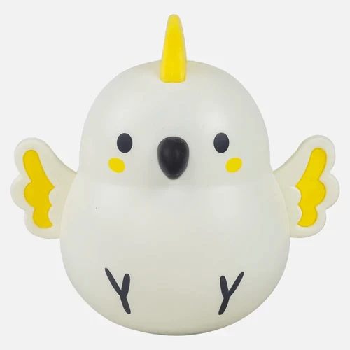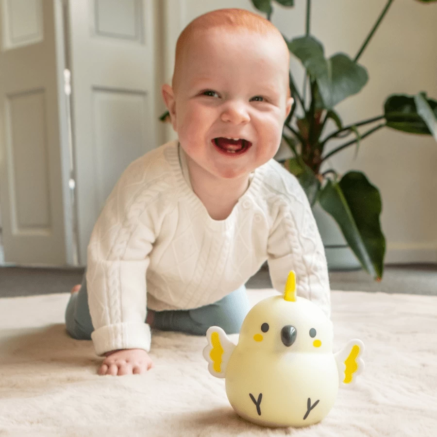 Roly Poly – Cockatoo loves being pushed, pulled and knocked over — always bobbing up for more fun. Ideal for babies learning to crawl and helps develop an understanding of cause and effect. As she rolls around she makes a lovely tinkling bell sound which adds additional sensory stimulation. Cockatoo’s wings and crest offer great grip points for small hands and the squishy beak adds extra textural interest.