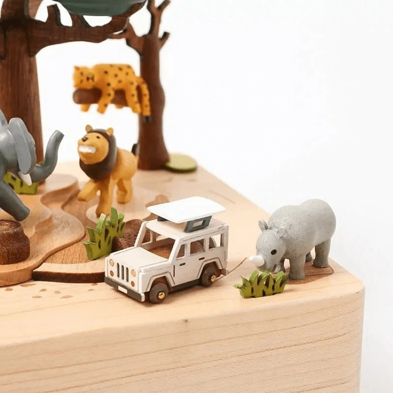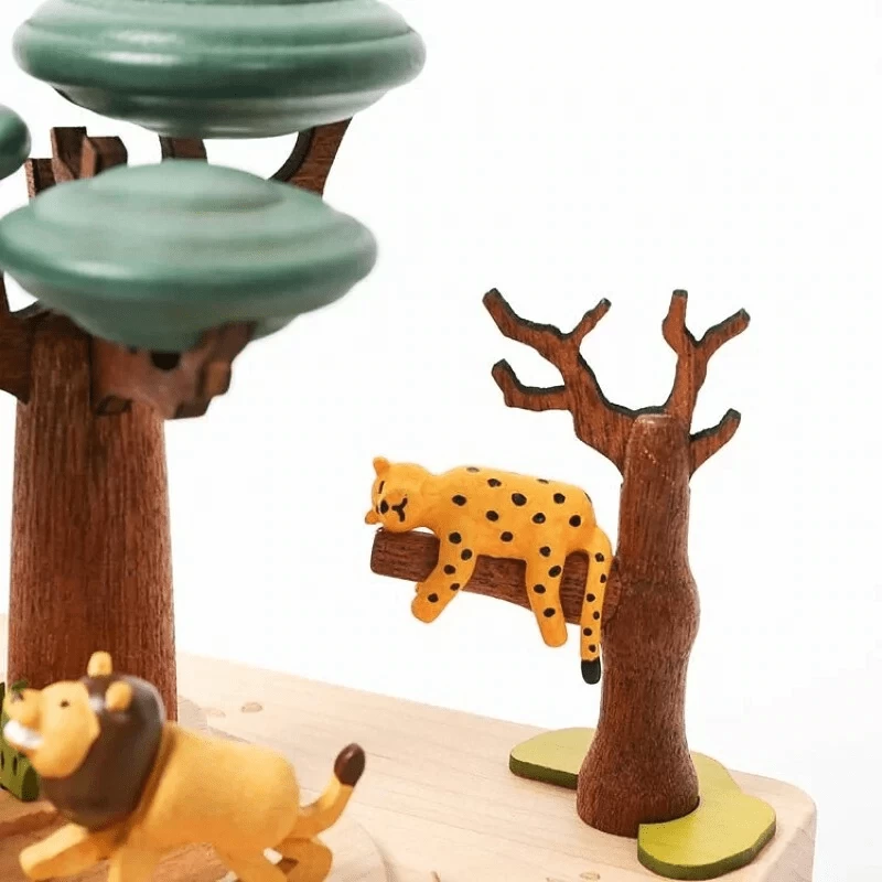 This Wooderful Life African Safari Round & Round Music Box features an adorable safari scene and complete with lazy leopard lounging in a tree